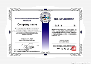 | 2021年11月・ | 都庁から申請中の環境イオン測定認証事業を認証する通知をいただく。 下記は環境イオン測定認証事業で授与する賞状です。 |